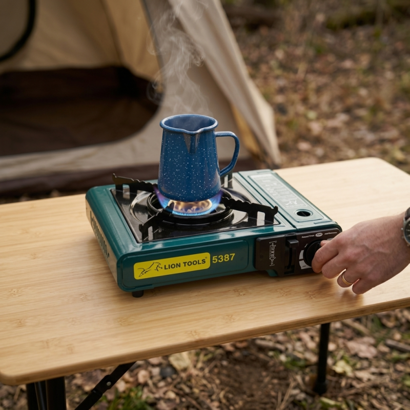 Estufa portatil de gas con estuche para usar en un dia de campo o emergencia